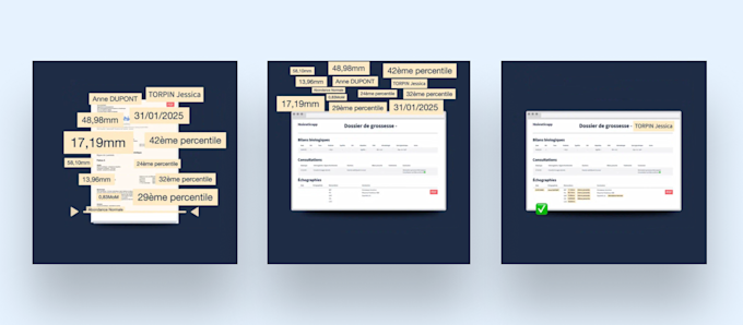 L'outil analyse vos fichiers, les stocke et place chaque donnée au bon endroit dans le dossier patient. Bilans biologiques, échographies, ordonnances de monitoring, comptes rendus médicaux… l'outil reconnaît ce qui compte et l'extrait pour vous.